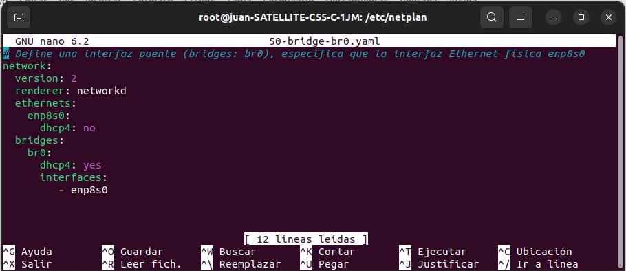In: root@juan-SATELLITE-C55-C-1JM:/etc/netplan# nano 50-bridge-br0.yaml
