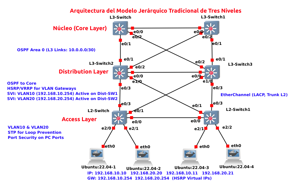 - Capa de Acceso (Access Layer): Esta es la capa más baja de la red. Aquí se conectan los dispositivos de usuario final, como las computadoras Ubuntu:22.04. Los L2-Switch son los que operan en esta capa y están configurados con VLANs (VLAN10 y VLAN20) para segmentar el tráfico, STP (Spanning Tree Protocol) para prevenir bucles de red y seguridad en los puertos para controlar el acceso.