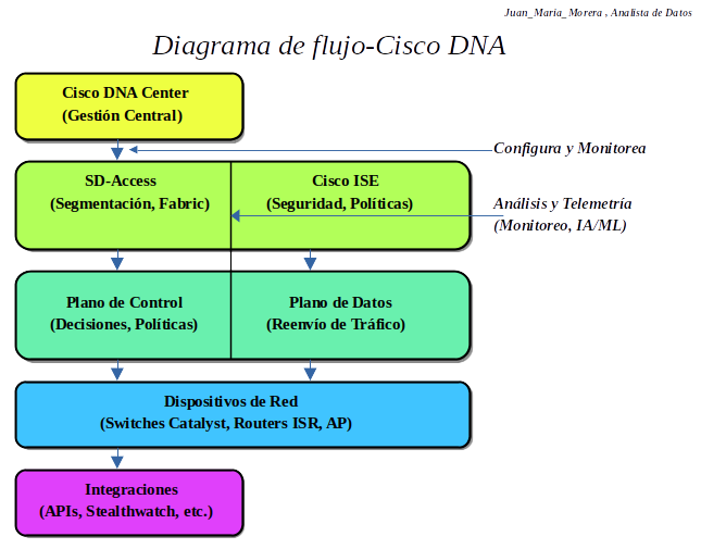 - Cisco DNA Center es el cerebro, orquestando todos los componentes.