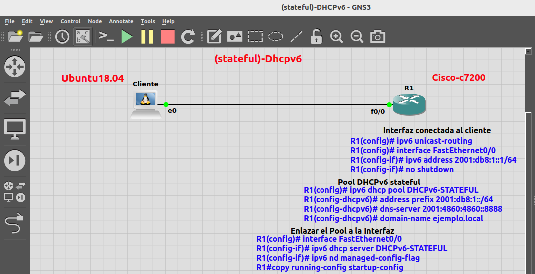 Nota: Para Verificar la configuración, necesitamos una topología GNS3; concretamente utilizaremos una versión reducidas del Laboratorio_10 Stateful-DHCPv6.