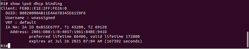- Para verificar las asignaciones de direcciones en modo Stateful, el comando show ipv6 dhcp binding muestra una tabla con las direcciones IPv6 asignadas a los clientes, incluyendo su DUID y el tiempo de arrendamiento.