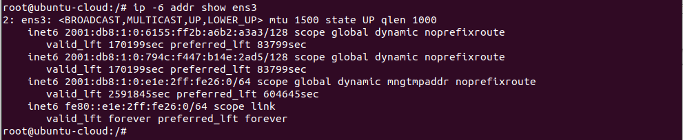 - In: root@ubuntu-cloud:/# ip -6 addr show ens3