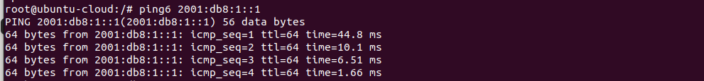 - In: root@ubuntu-cloud:/# ping6 2001:db8:1::1