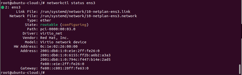 - In: root@ubuntu-cloud:/# networkctl status ens3